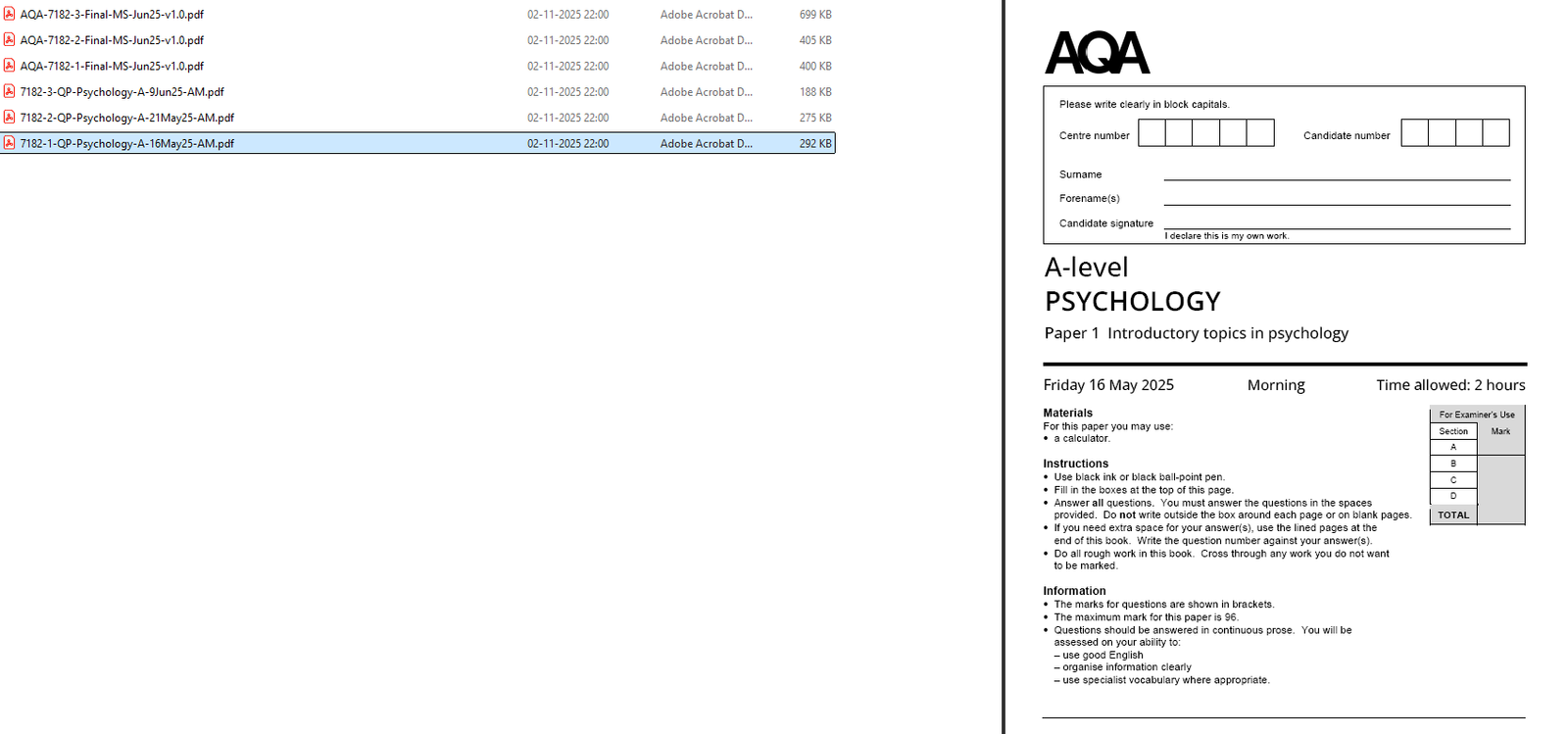 AQA A LEVEL PSYCHOLOGY 2025 JUNE QUESTION PAPERS WITH MARKING SCHEME