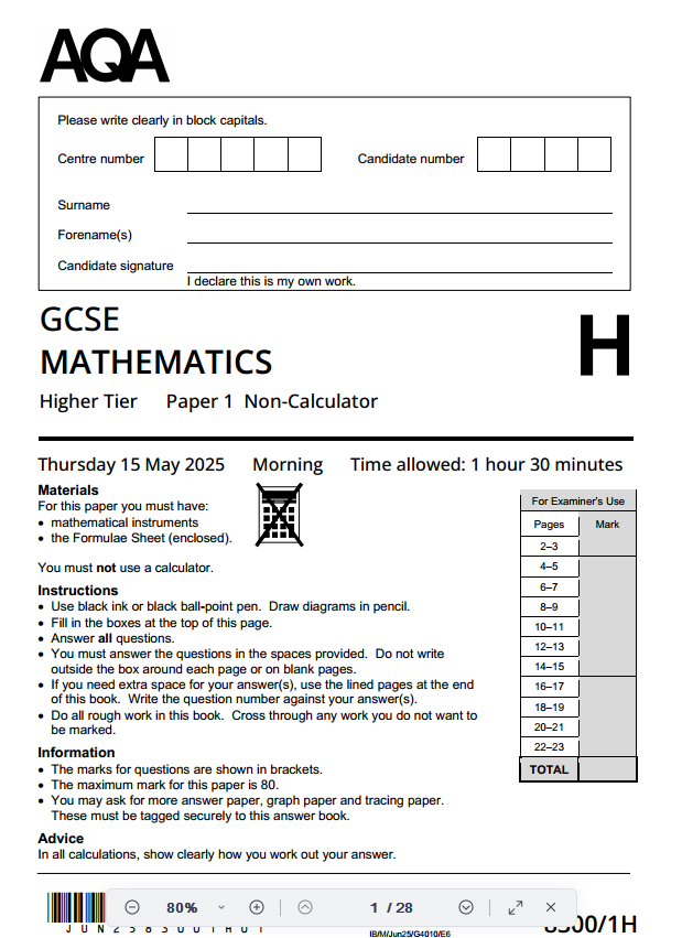 AQA GCSE MATHS (Higher) 2025 JUNE PAPERS WITH MARKING SCHEME
