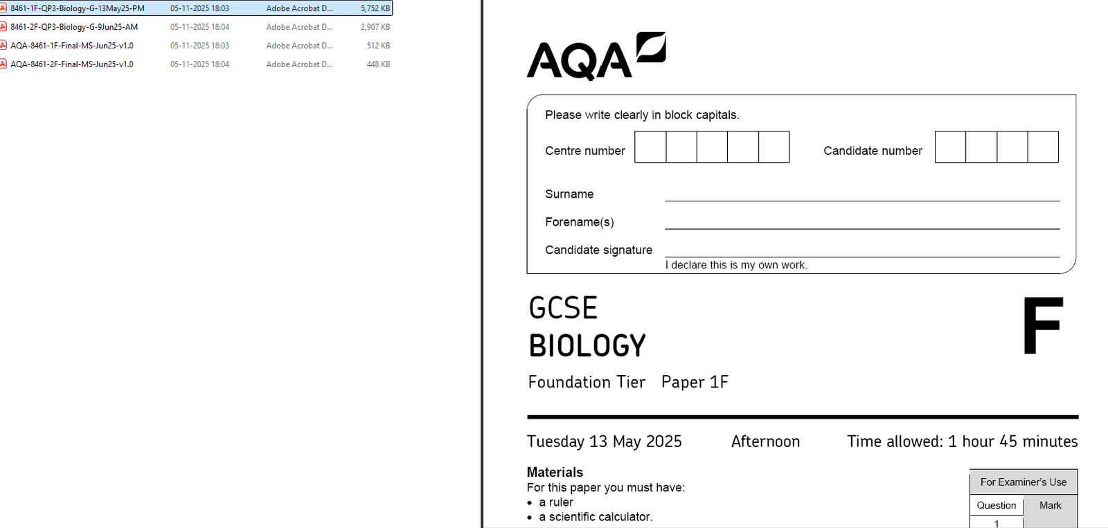 AQA GCSE TRIPLE SCIENCE (Foundation) 2025 JUNE PAPERS WITH MARKSCHEMES